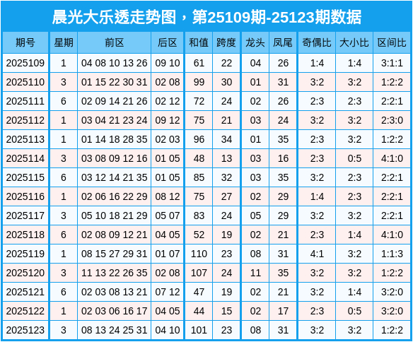 大乐透第25123期前区奖号为:08 13 24 25 31;后区04 10。前区号码质合比为2:3沈阳市沈北新区联天红商贸中心,奇偶比为3:2,三区比为1:2:2。