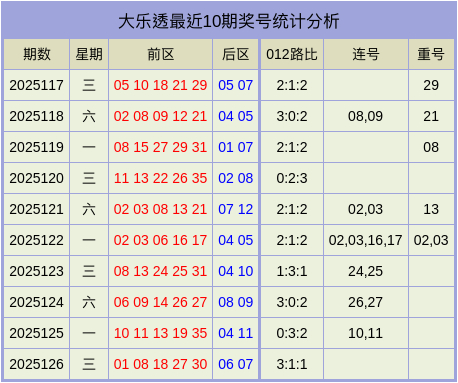 后诀别析:上期开出后区06、07,最近10期的后区奇偶比为10:10,本期珍爱【奇偶】数后区,看好后区号码:05、12。