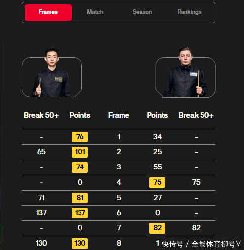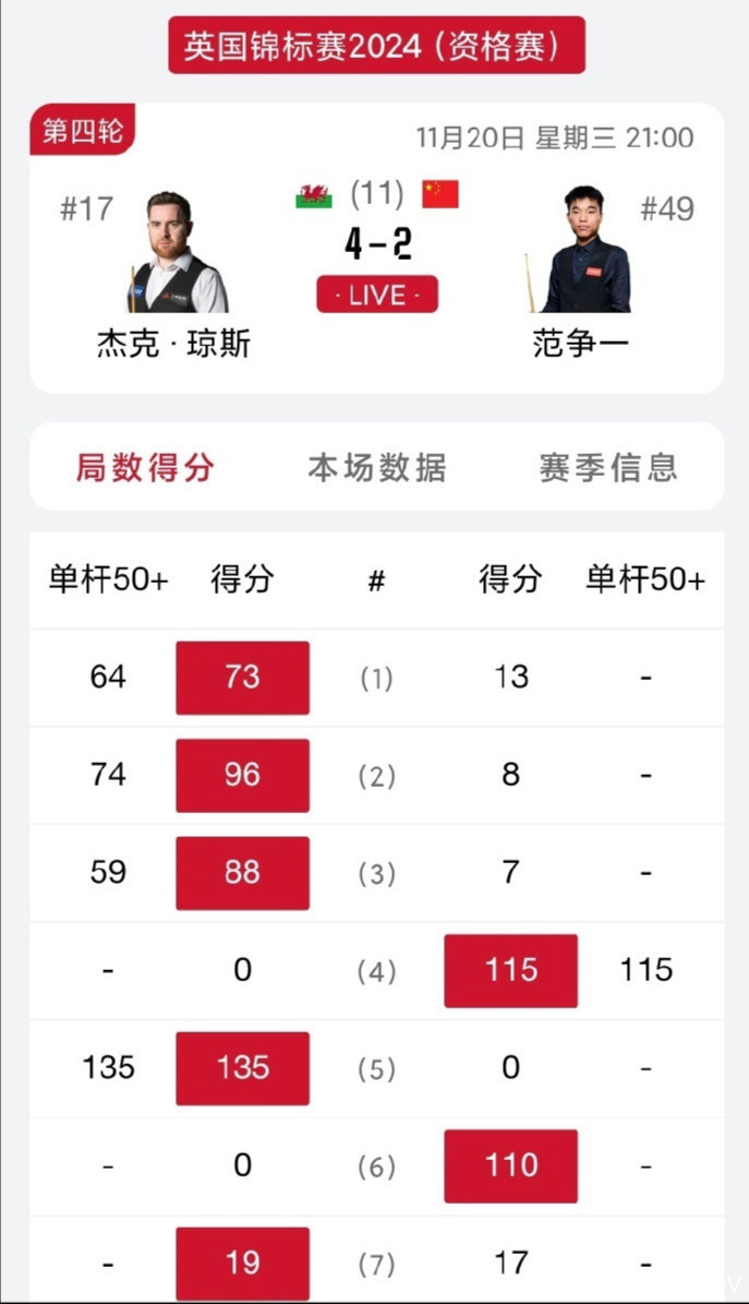 第二局,努斯勒打出单杆76分,83-1再胜一局,2-0格外。第三局,开场连输两局以后,范争一运行发力,他轰出单杆104分,122-0零封敌手,12扳回一局。